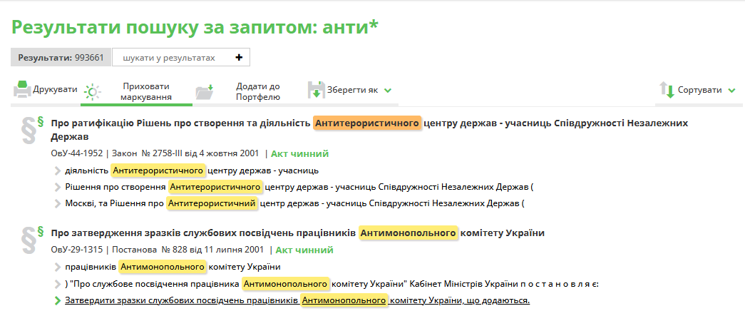 Уведення послідовності анти* призведе до пошуку документів, що містять слова: антикорупційний, антимонопольний або антитерористичний, у різних формах: