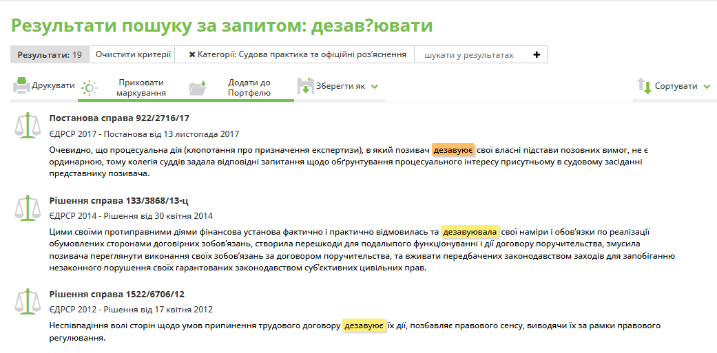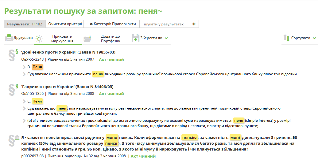- Нечіткий (розмитий) пошук – використовується для пошуку так званих “нечітких” виразів, наприклад, коли Користувач не впевнений щодо звучання шуканого слова. Після введення, наприклад, пеня~, будуть знайдені документи, що містять також слова, схожі на введений запит пеня, наприклад, пенсія, мене, мені тощо.
