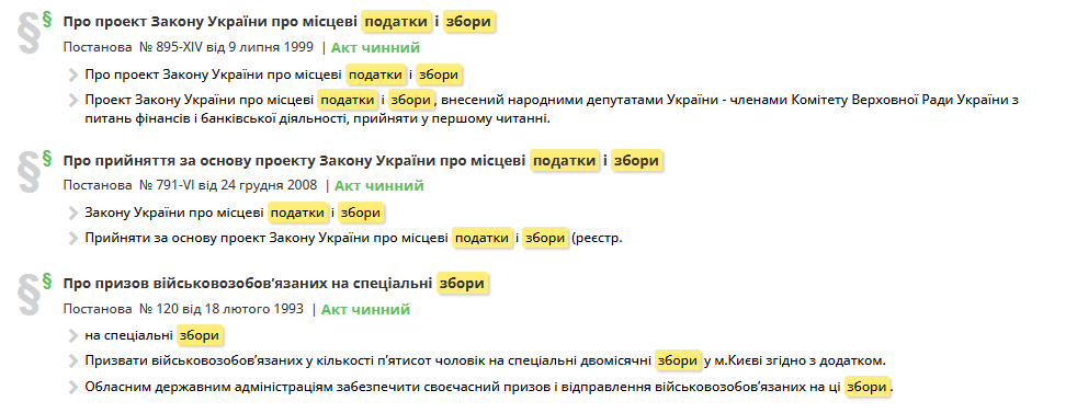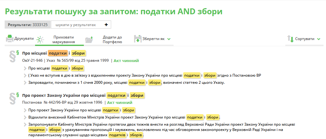 - податки OR збори – кожен знайдений документ міститиме принаймні “податки” або “збори”; або ж і “податки”, і “збори”, незалежно від заданого порядку.