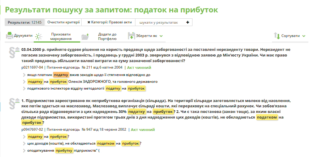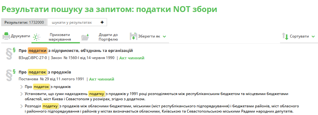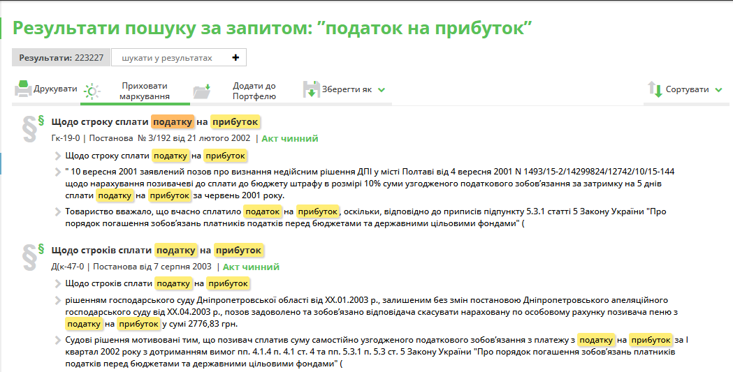 Приклад результатів пошуку для запиту податок на прибуток та ”податок на прибуток”