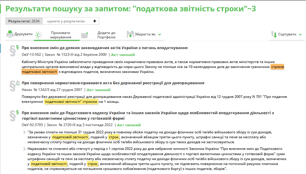 - ”податкова звітність строки”~3 – буде знайдено документи, де одночасно є слова податкова, звітність та строки, але не обов’язково поруч:
